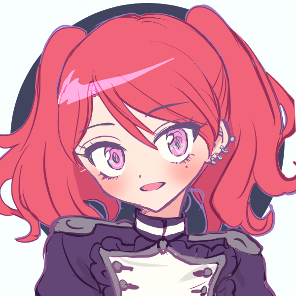 髪色は真紅、瞳は桜色。肌の色は若干黒め。やや短めに整えた髪を二つ結びにしている。