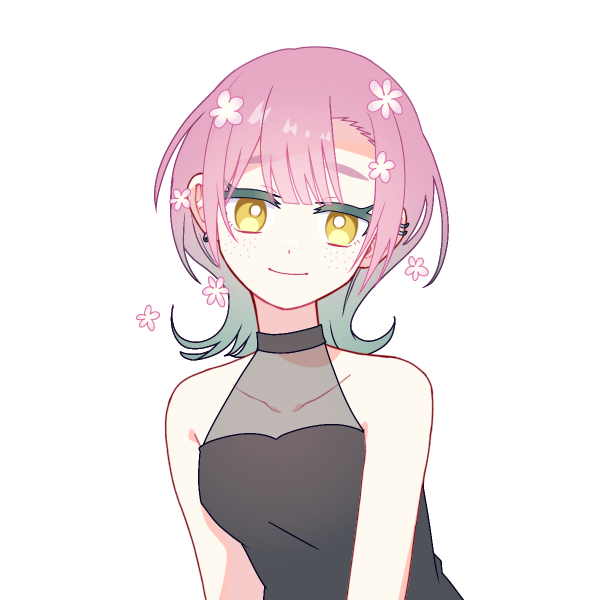 ピンクの髪をウルフヘアにカットしており、頭に桜の花が咲くメリア。