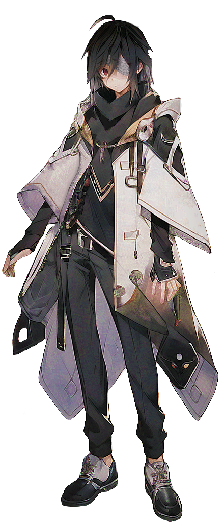黒の髪、山吹色の目とアビスボーン特有の目(普段は包帯で隠している)、白いローブ、黒い服装(首にマギスフィア、胴にソフトレザー、腰にガンポーチ、ガン1丁が入ってるホルスター、足にバレットポーチ)
