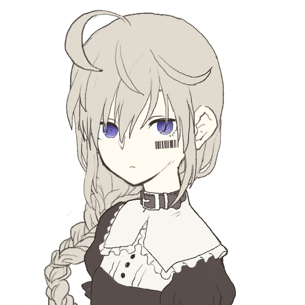 ・首の一部と目が硬質素材。左目の下にバーコードのような刻印。灰色の髪に紫の目、身長は少し小さい