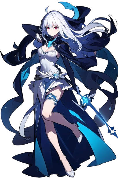 綺麗な白髪のロングヘアーに露出させたワンピース、紺色のロンググローブと白色のサイハイストッキング、ロングマントを羽織った美女。