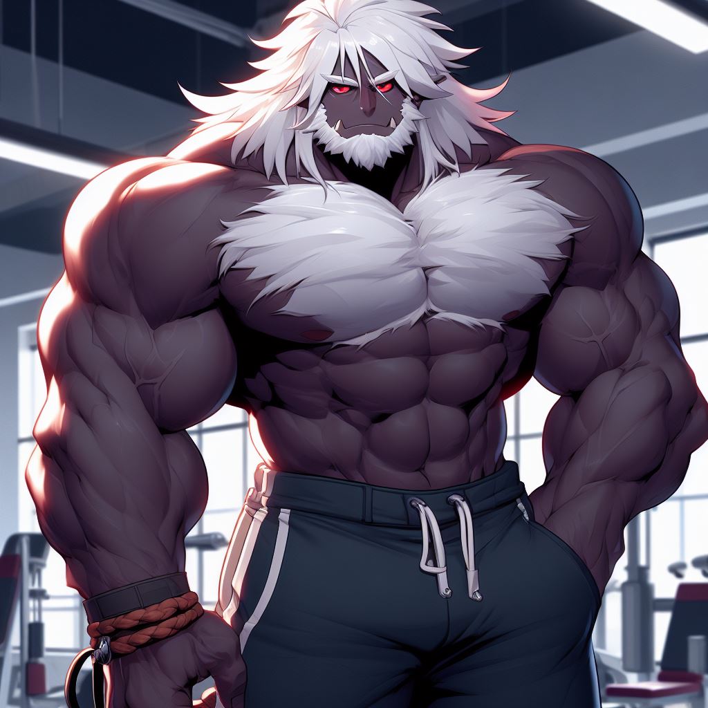 浅黒い肌をした屈強な肉体の白髪男子。