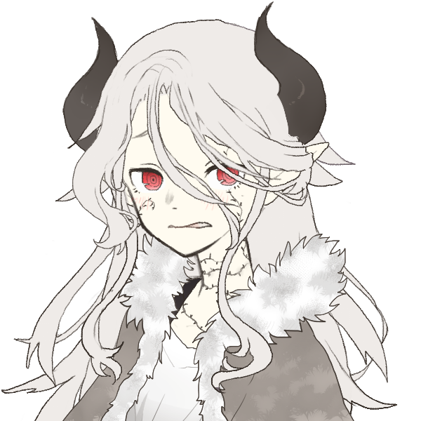 ・容姿 ボサボサの長い白髪に赤い目の少女胸元から顔にかけて刺青がある。