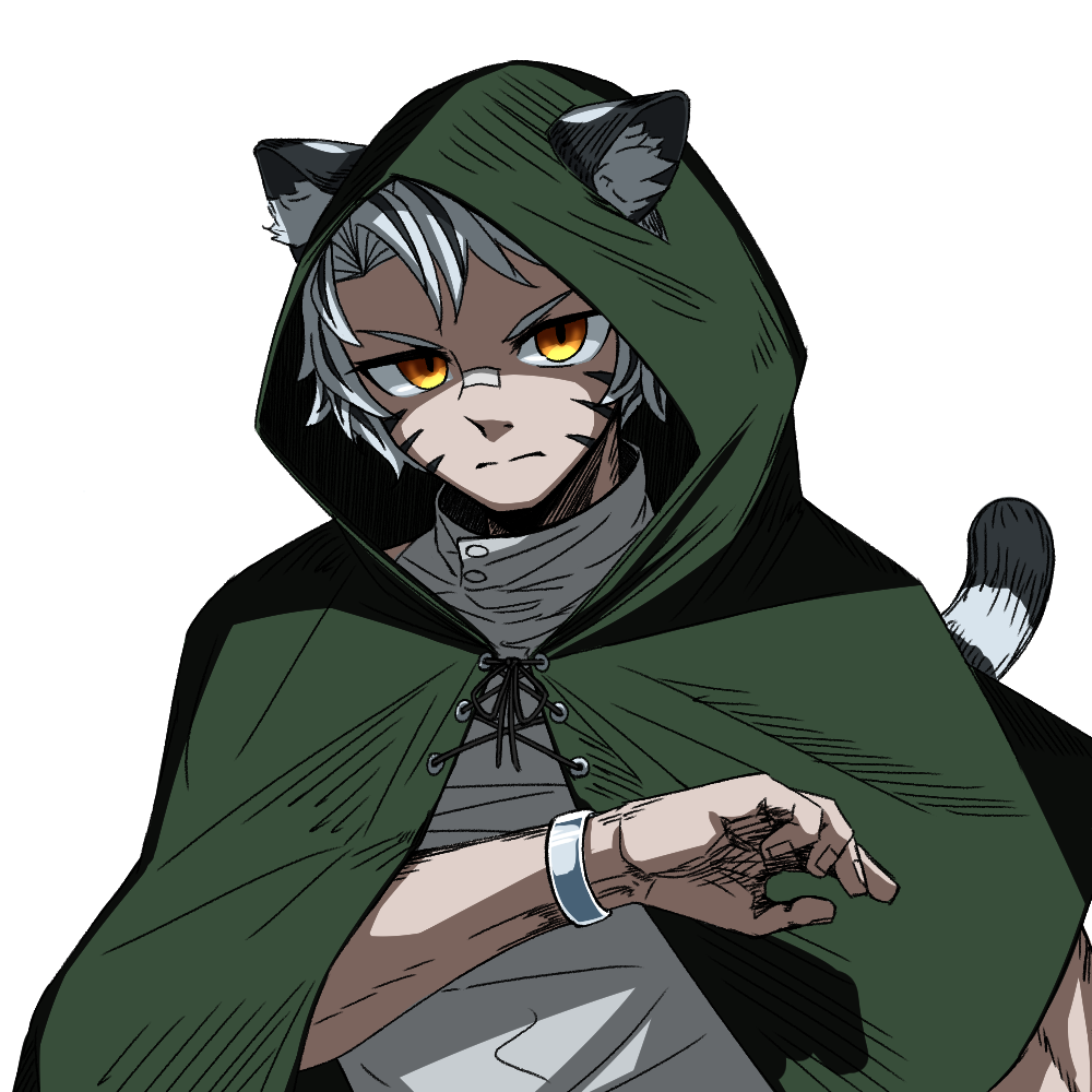白髪虎柄のリカントの青年。白い髪では目立つからとフードで頭を覆っている。気の強い母や姉に囲まれて育ってきたためか、気が弱い。