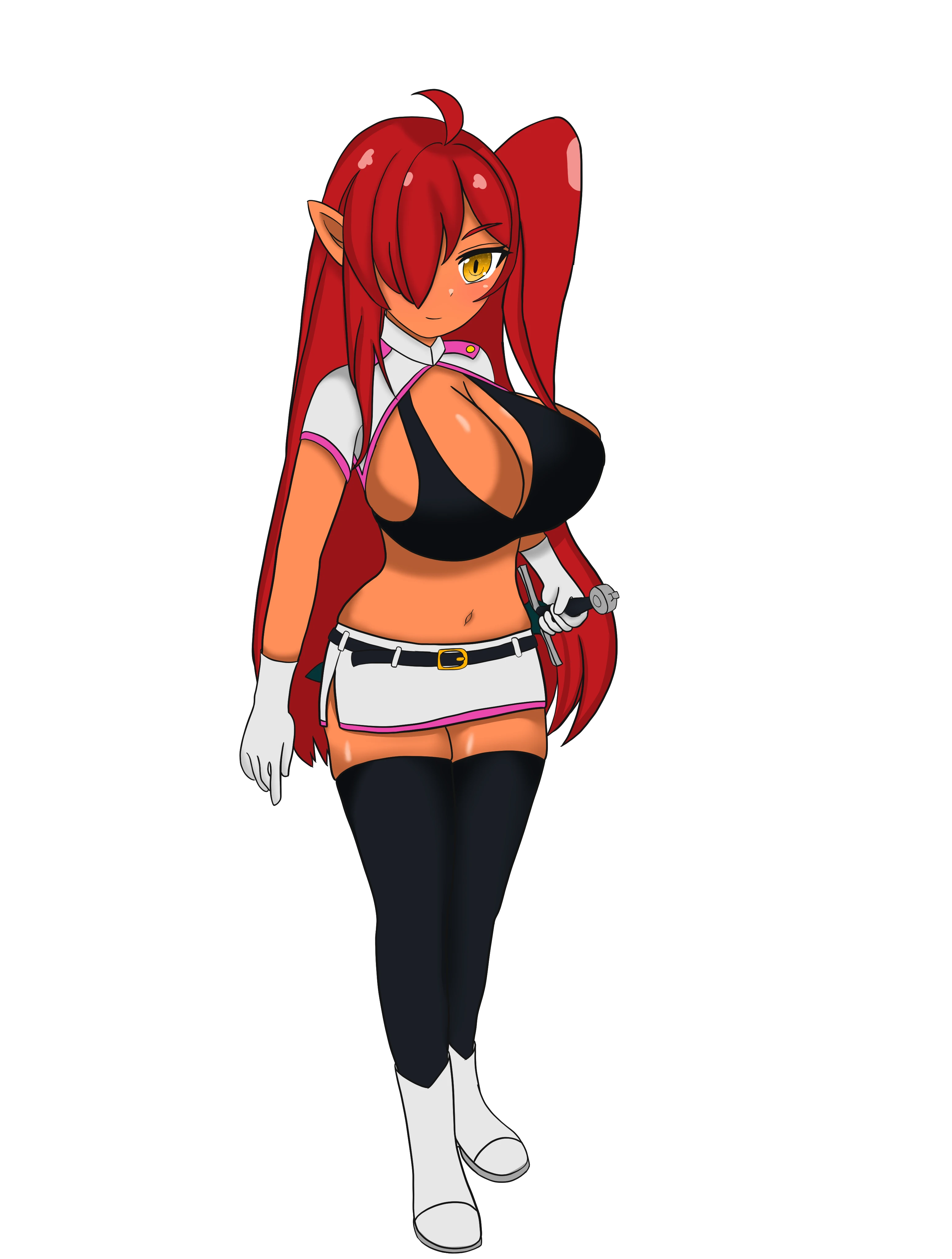 その姿はダークエルフのような褐色肌に紅を思わせる赤く片目が隠れるほど長い髪、見える瞳は金色に輝きドワーフ並みに背が小さい。