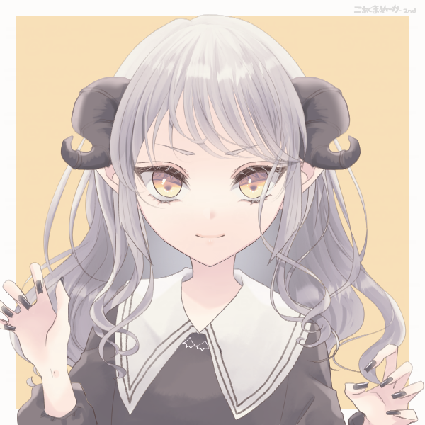 長いくせ毛の銀髪、ヤギのような角、琥珀色の瞳(元々は翡翠色)